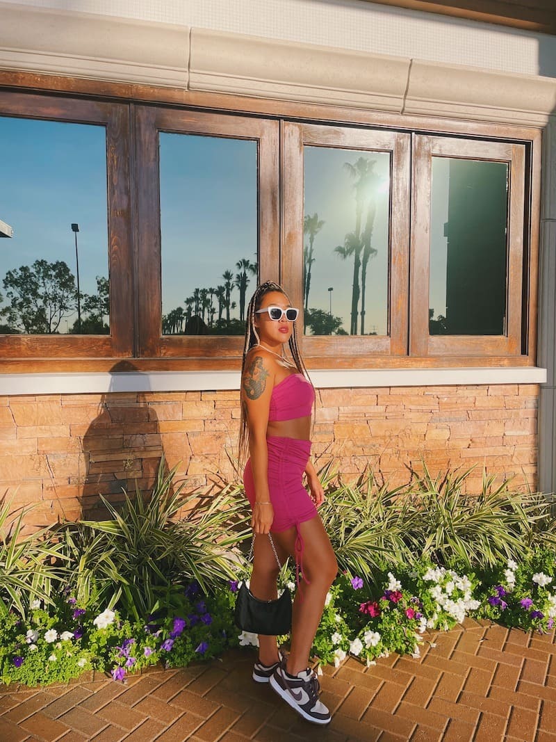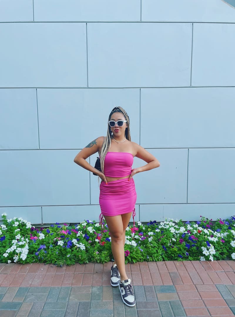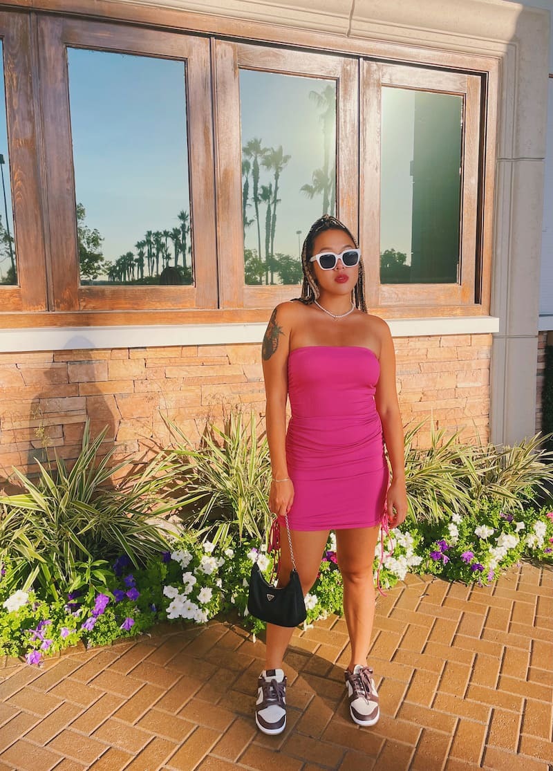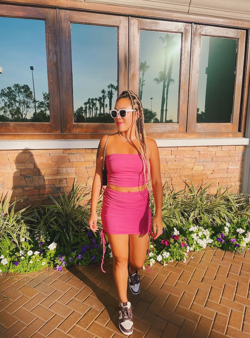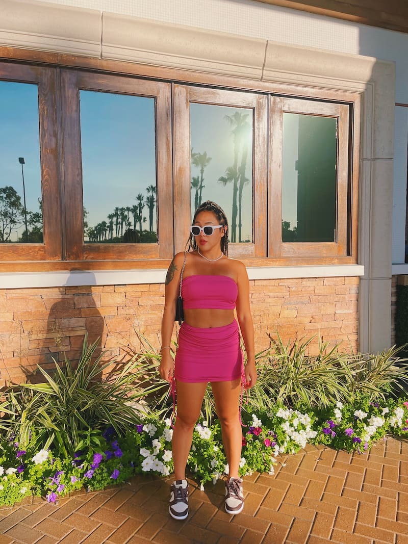 桃粉色套裝,平口搭配包臀短裙