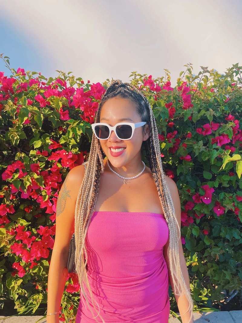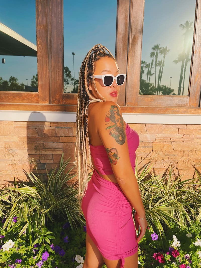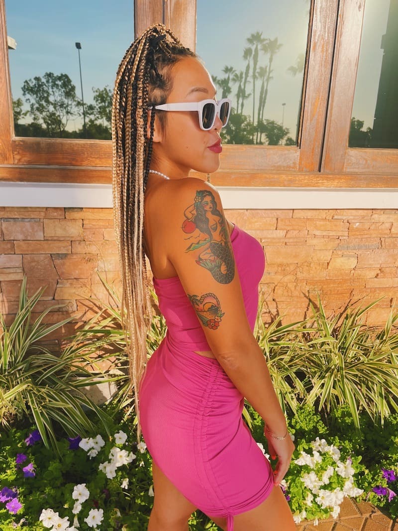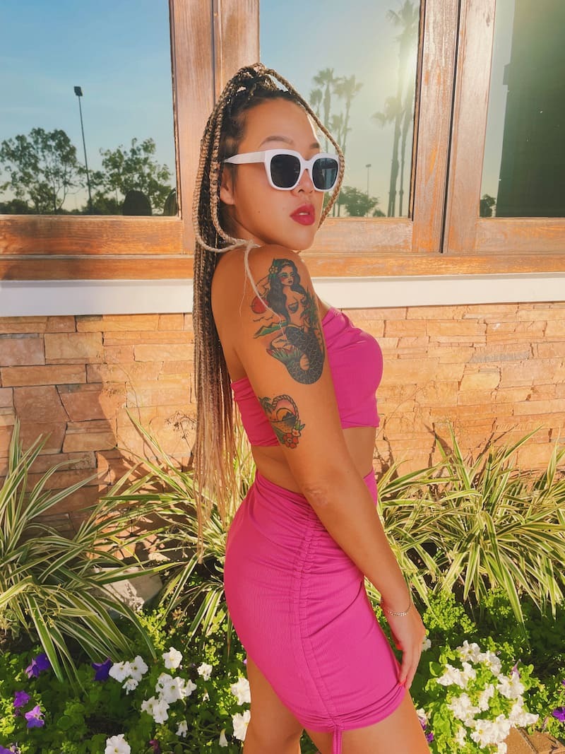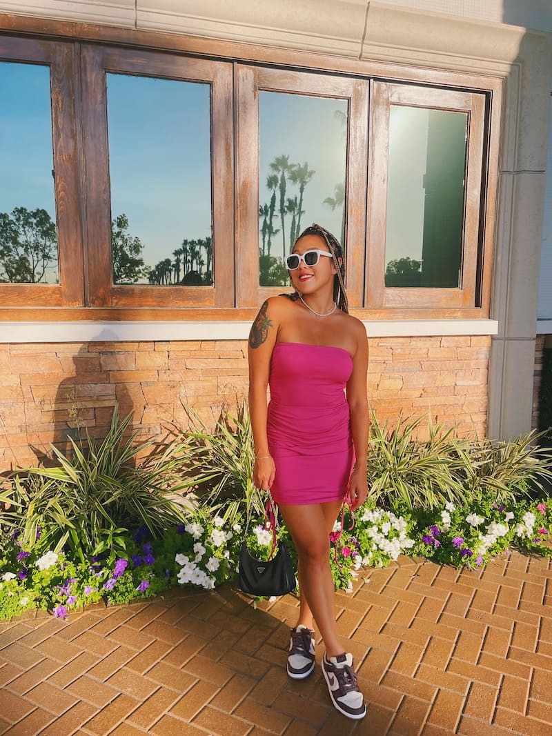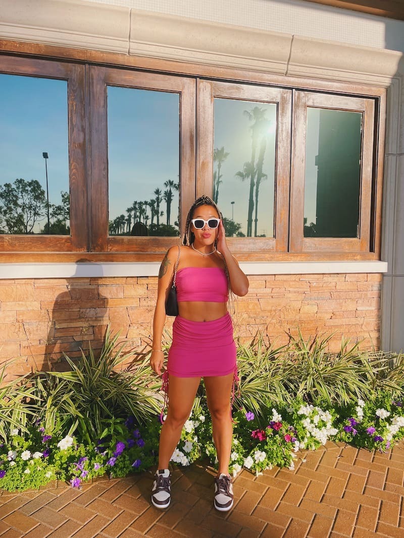 桃粉色套裝,平口搭配包臀短裙