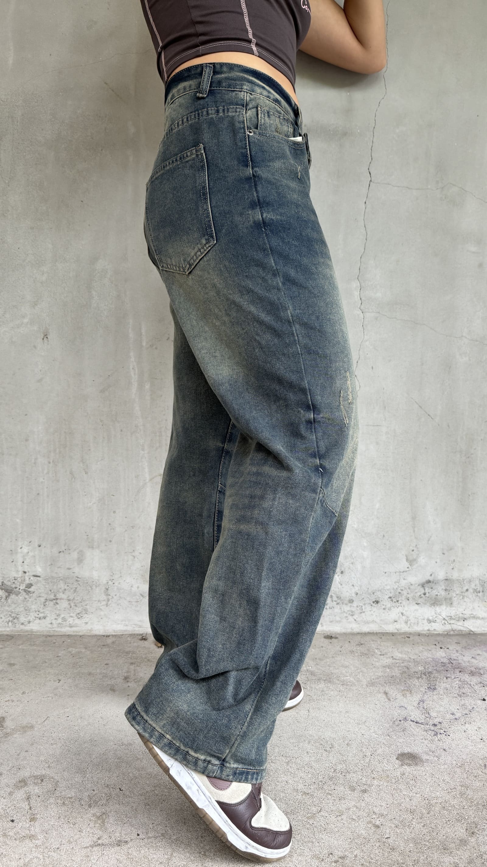 寬褲版型,小細節的刷破線條感