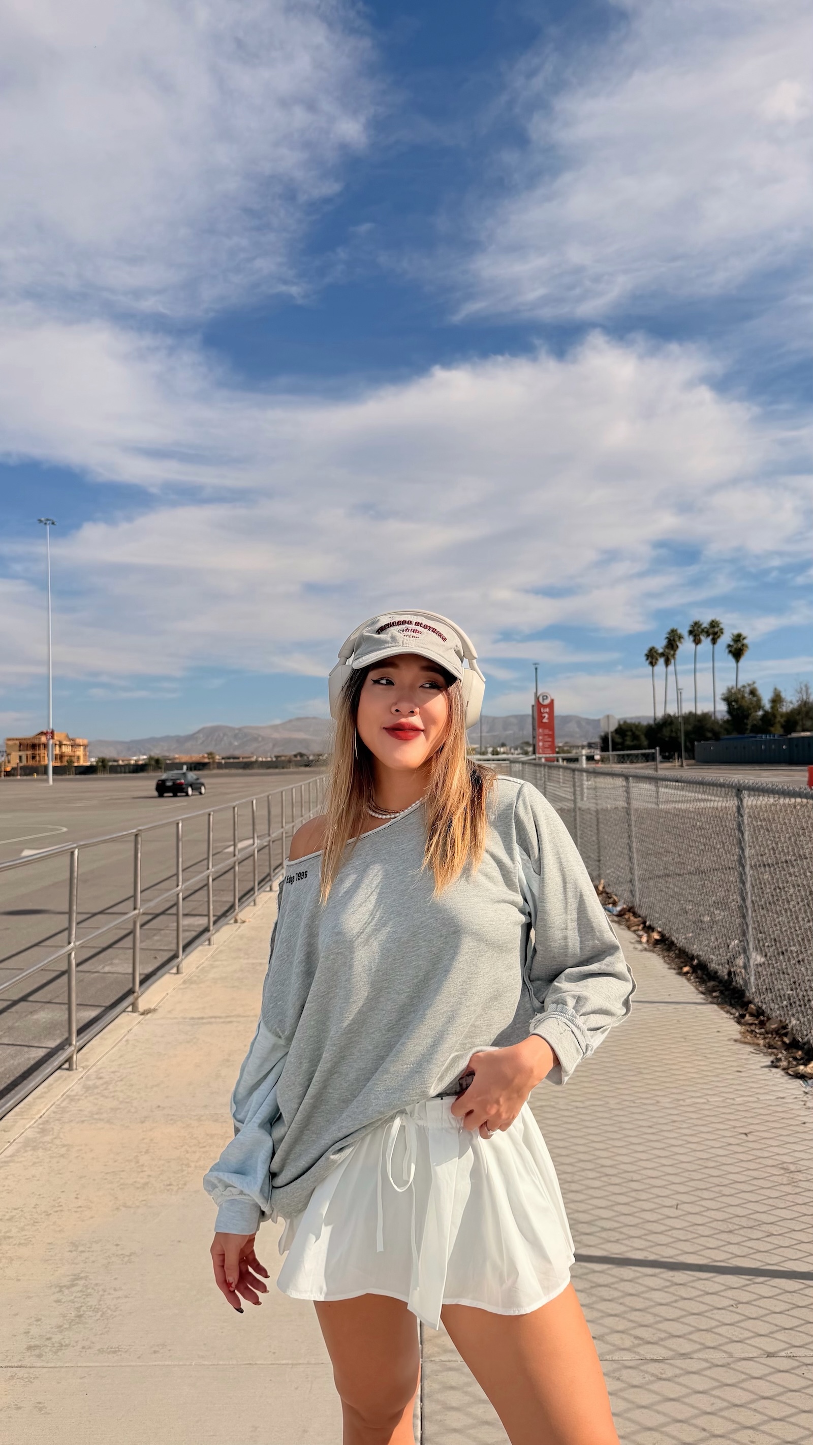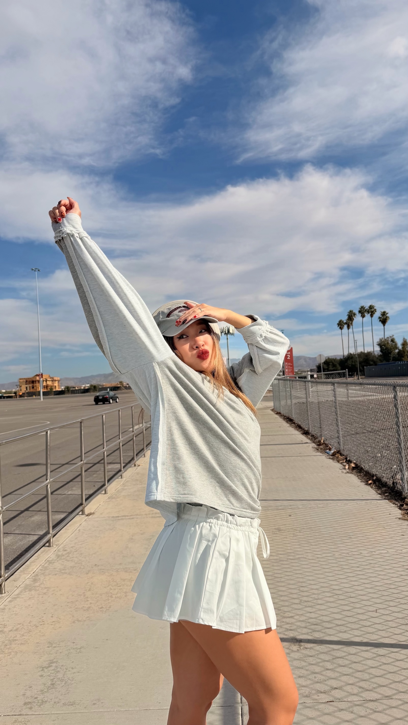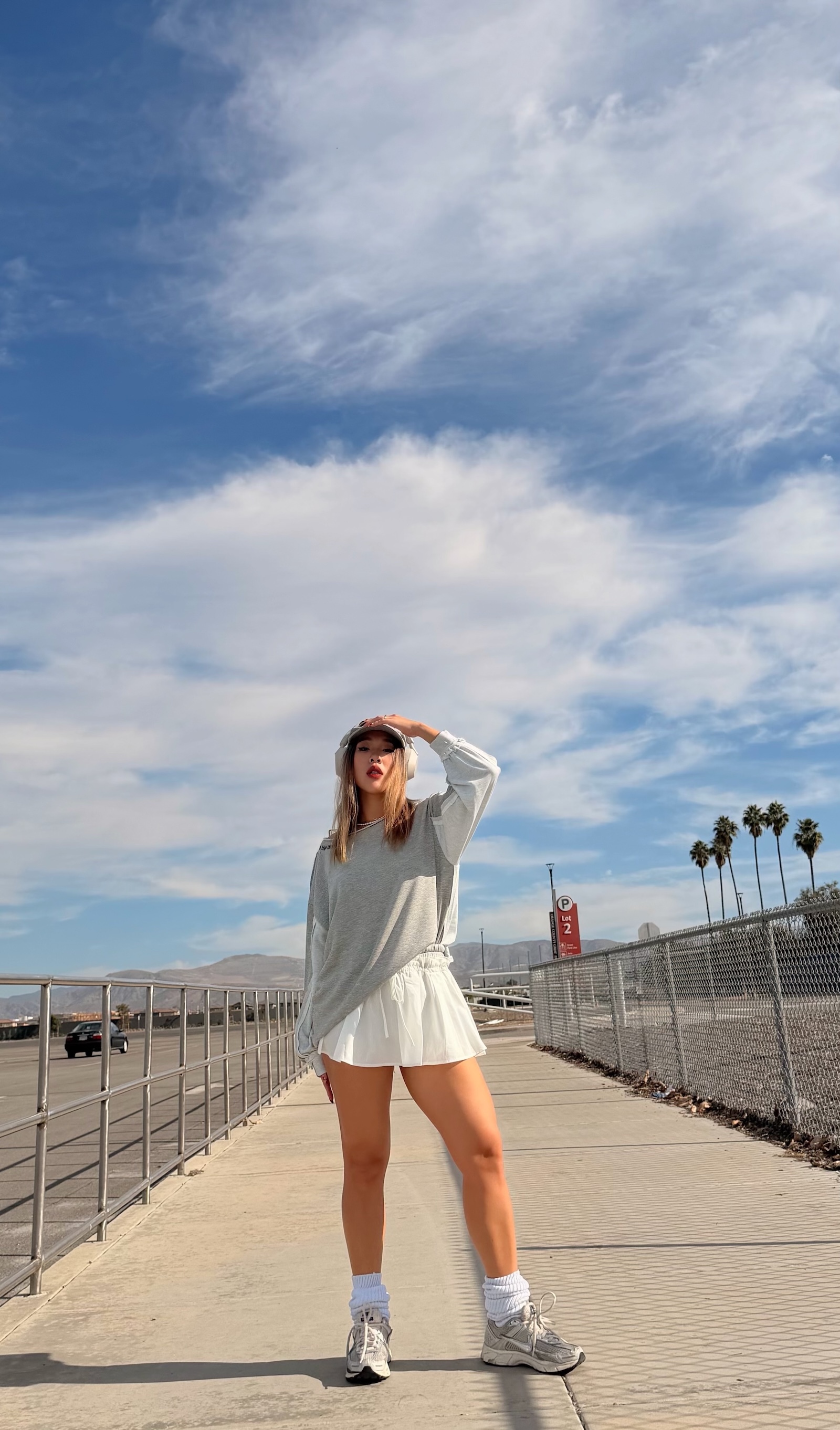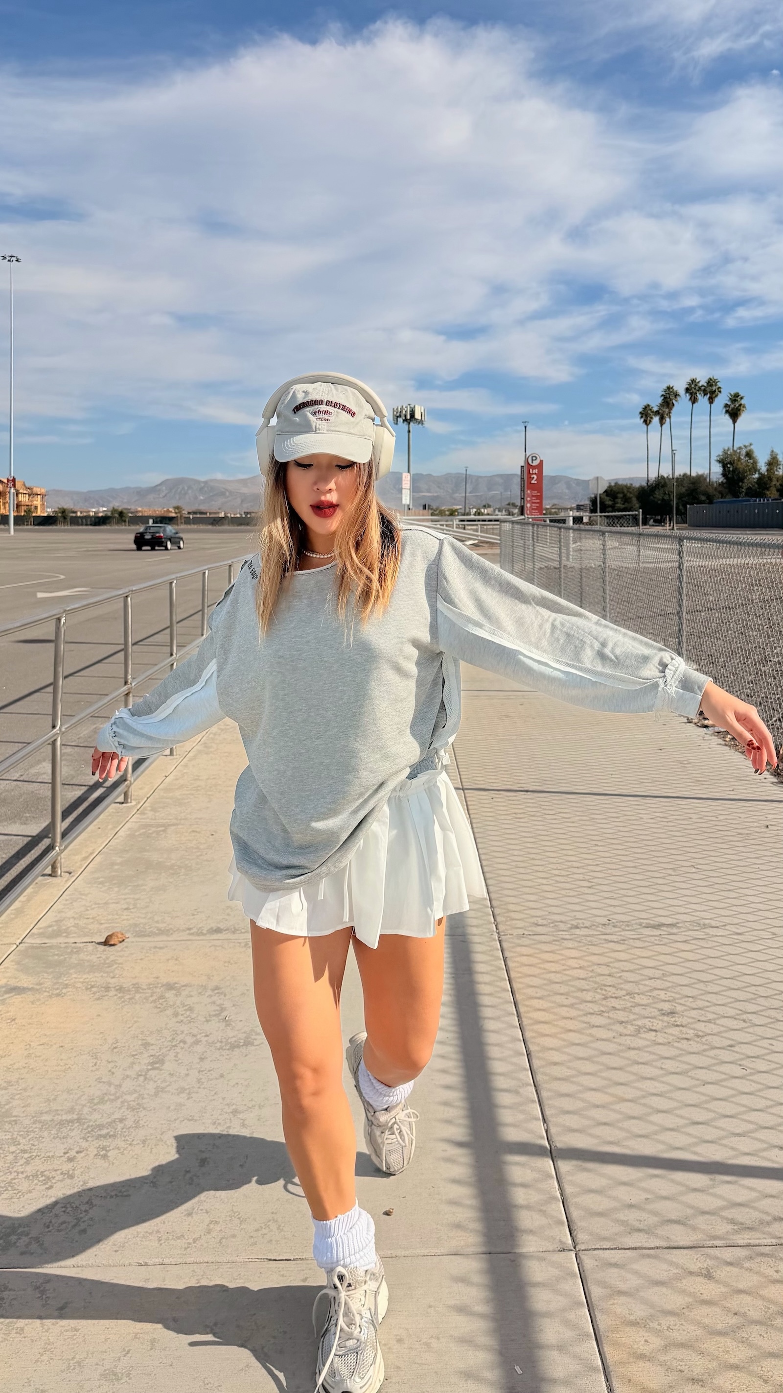 寬鬆搭配白色百褶裙,整套或分開搭都可以