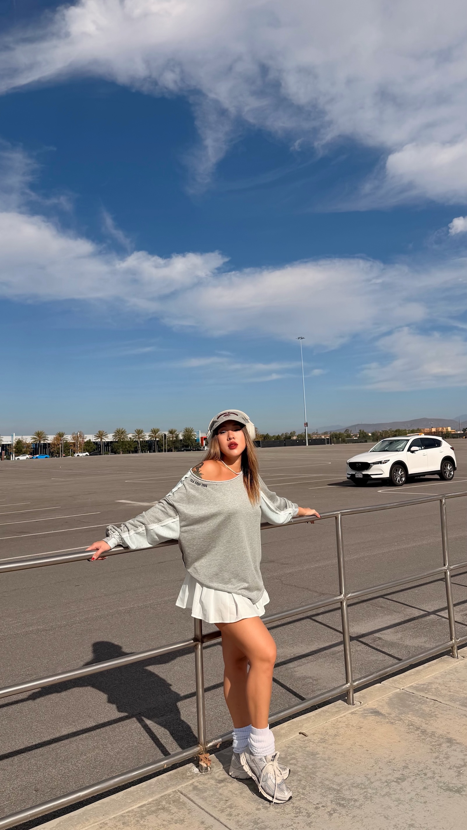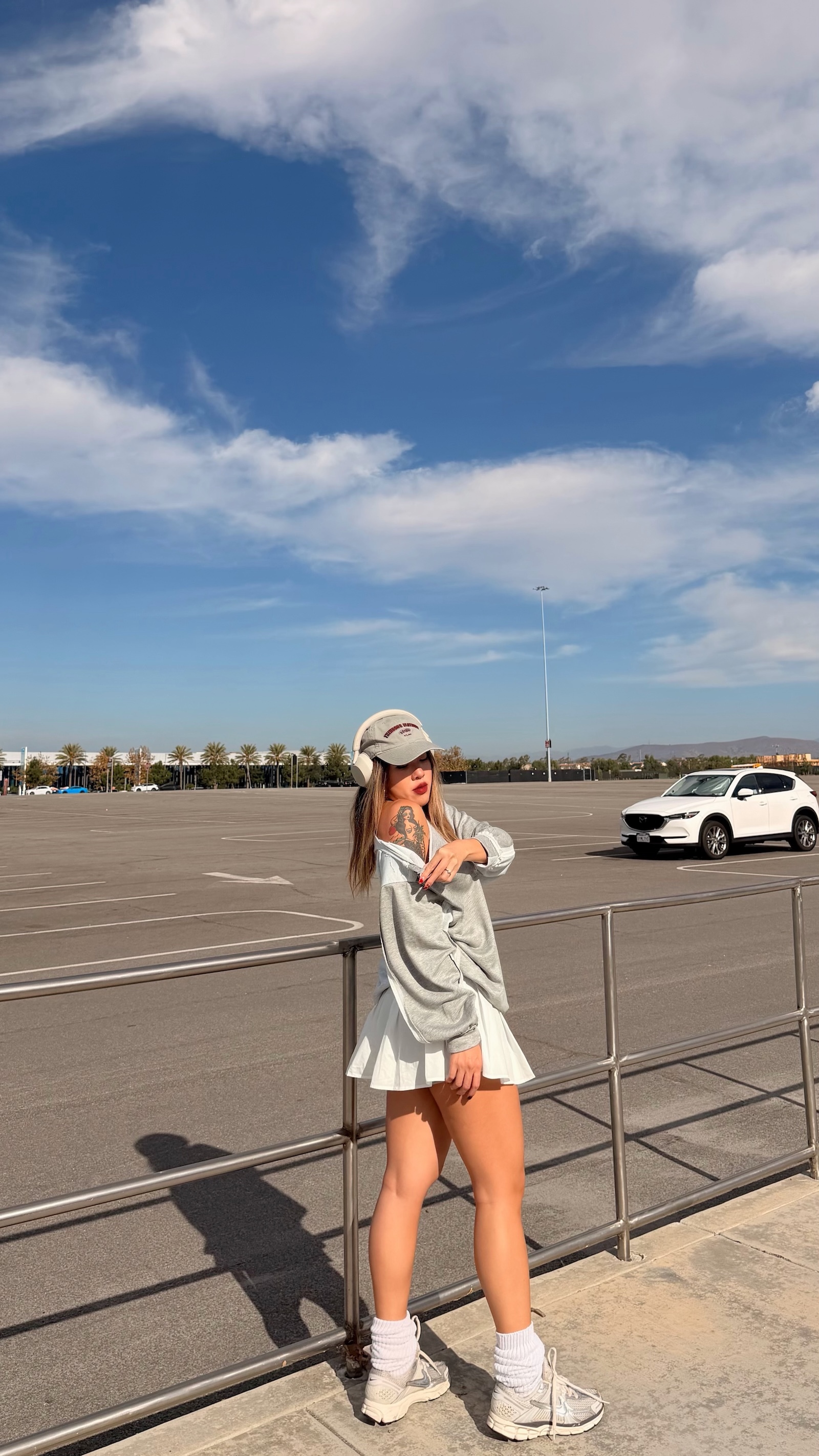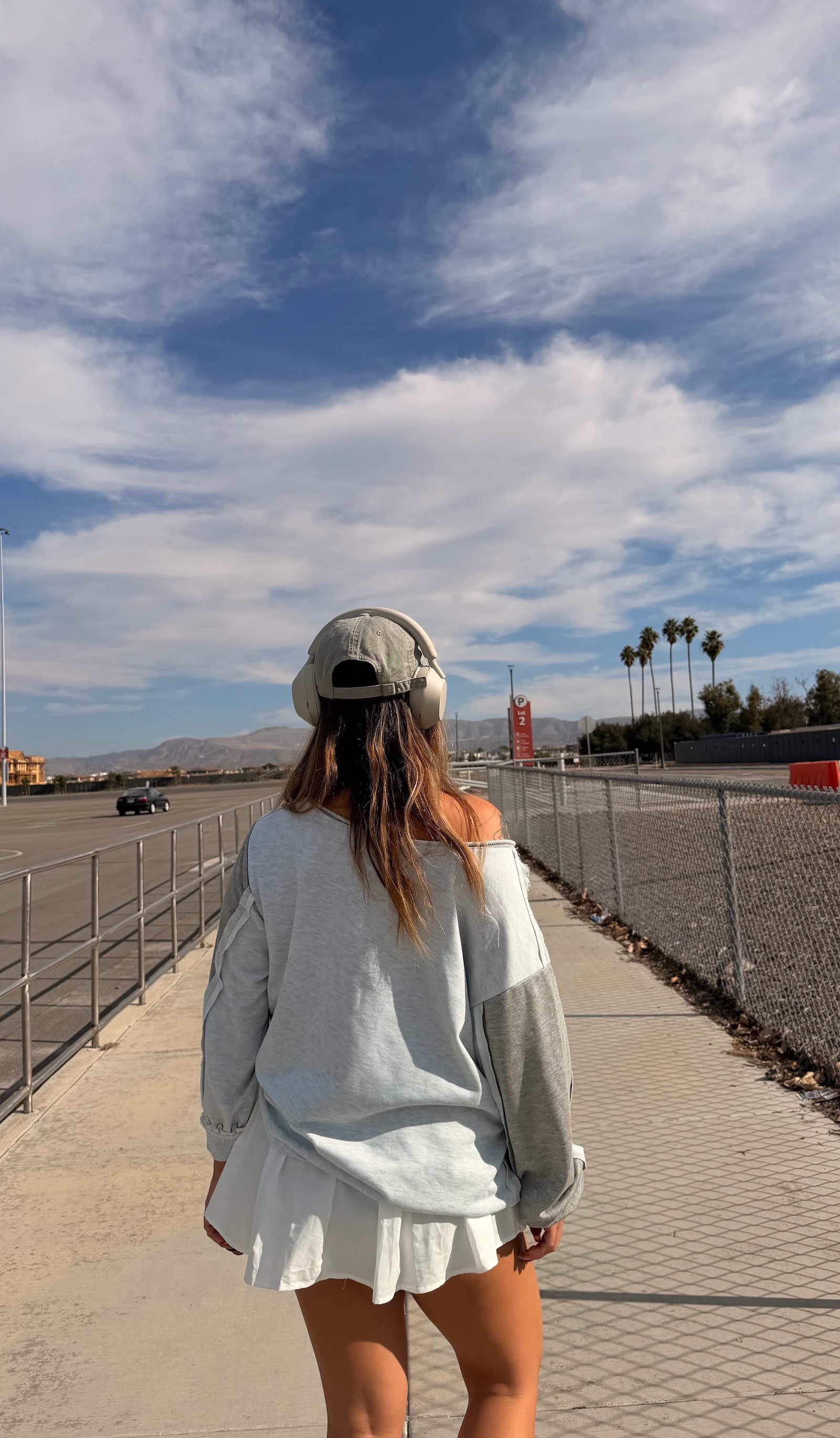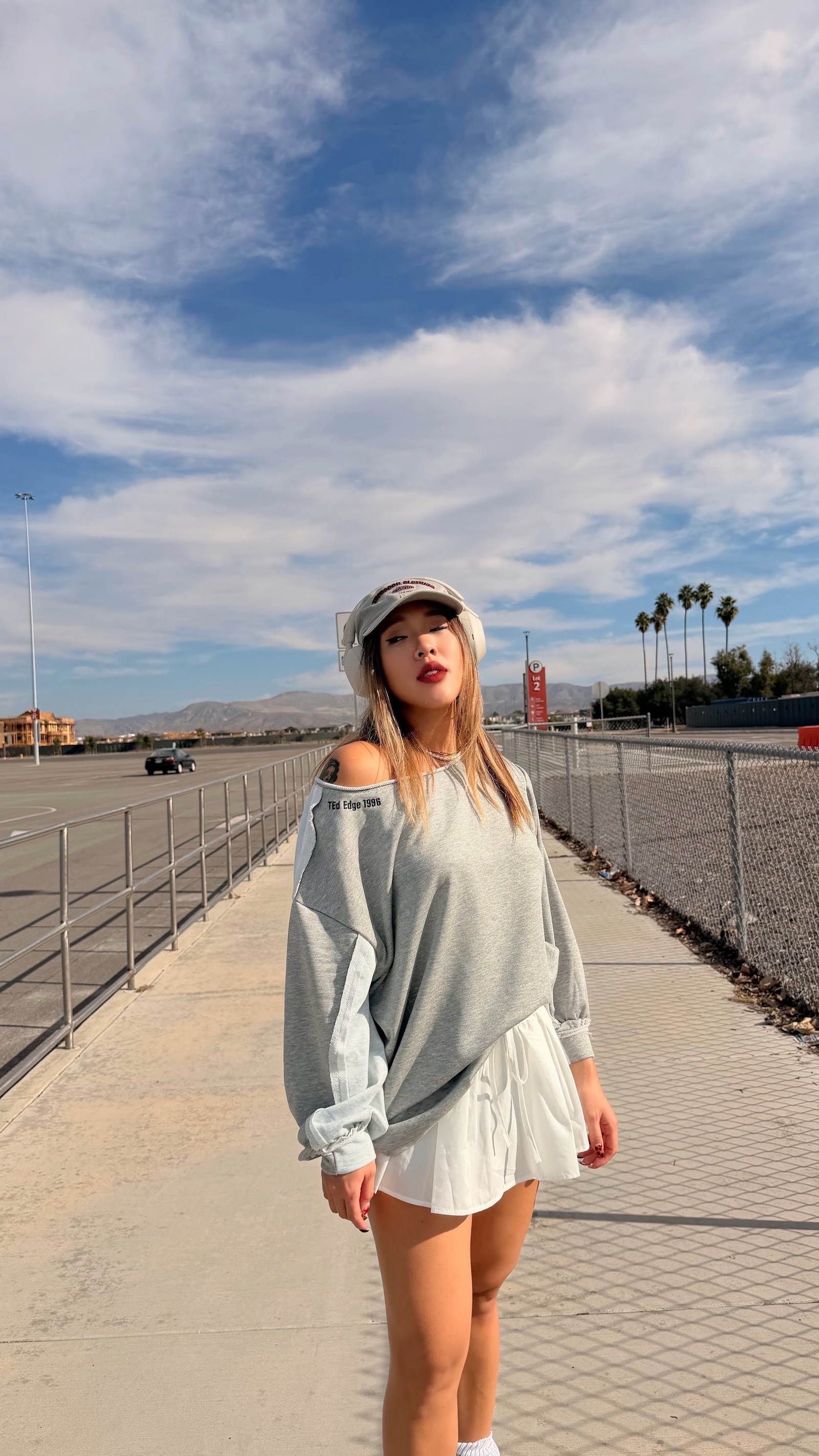寬鬆搭配白色百褶裙,整套或分開搭都可以