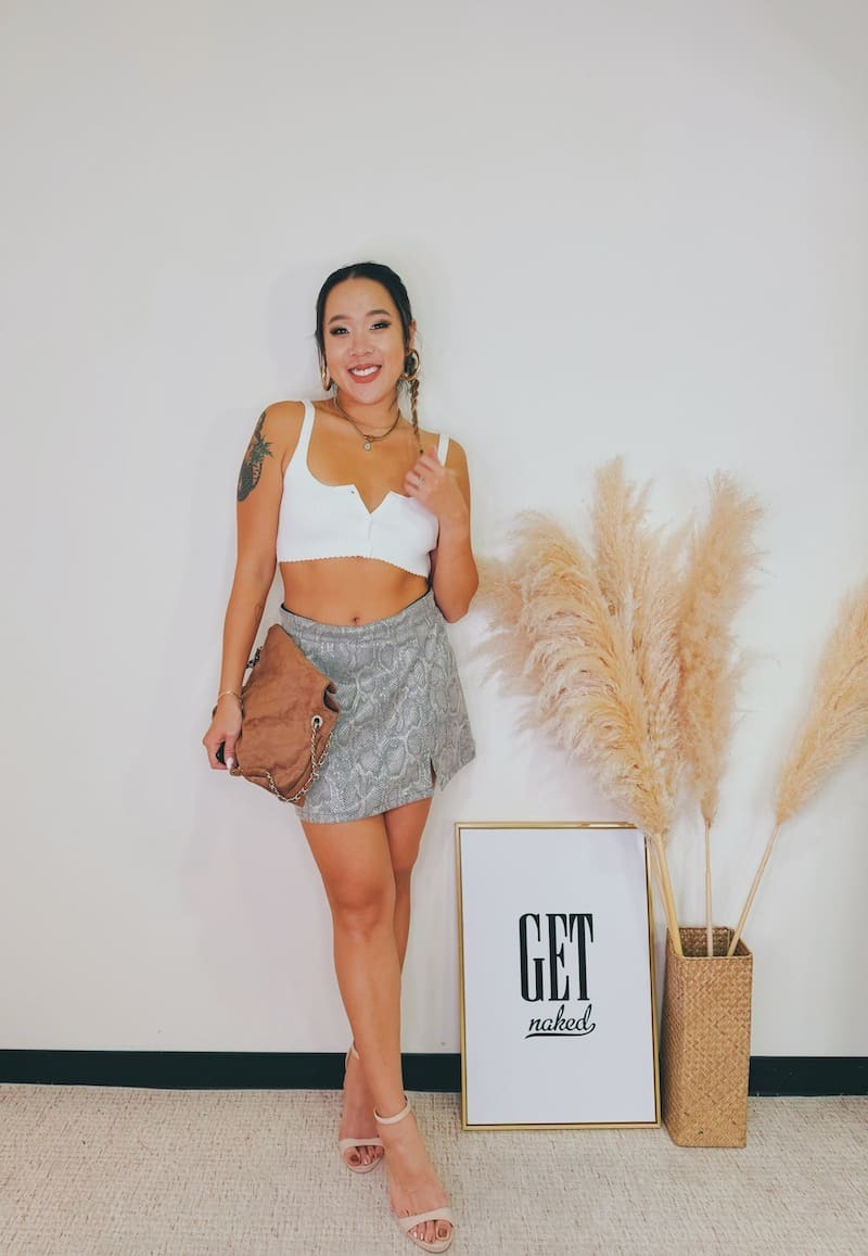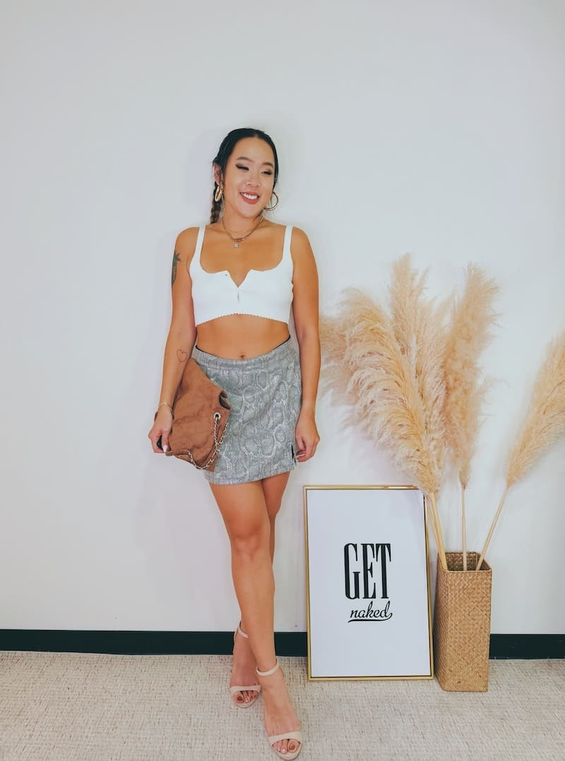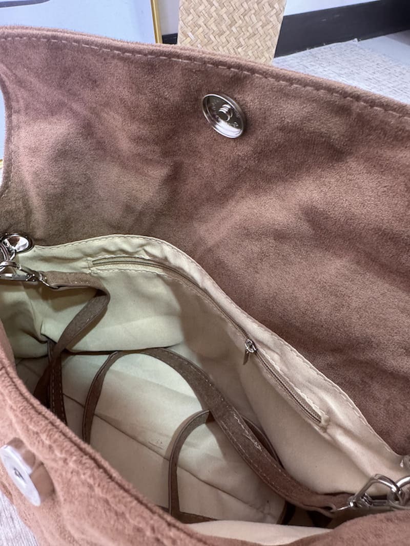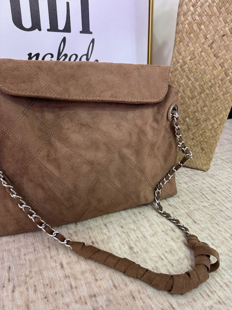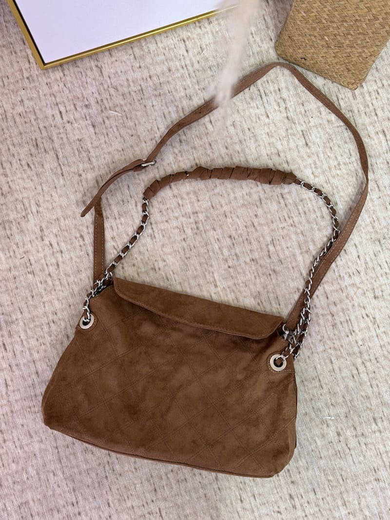 銀色金屬包邊鏈條,配上隨性的麂皮線條