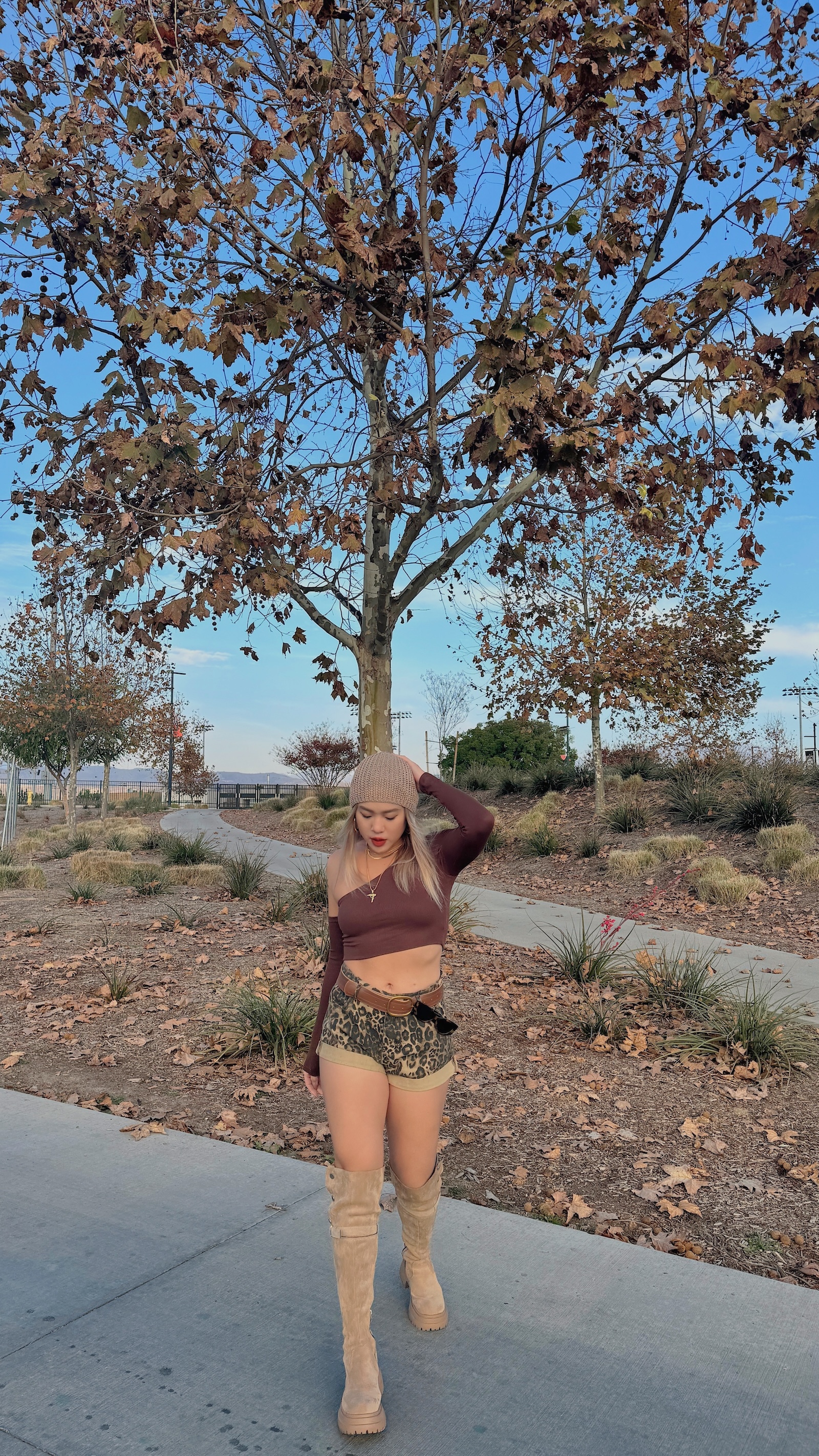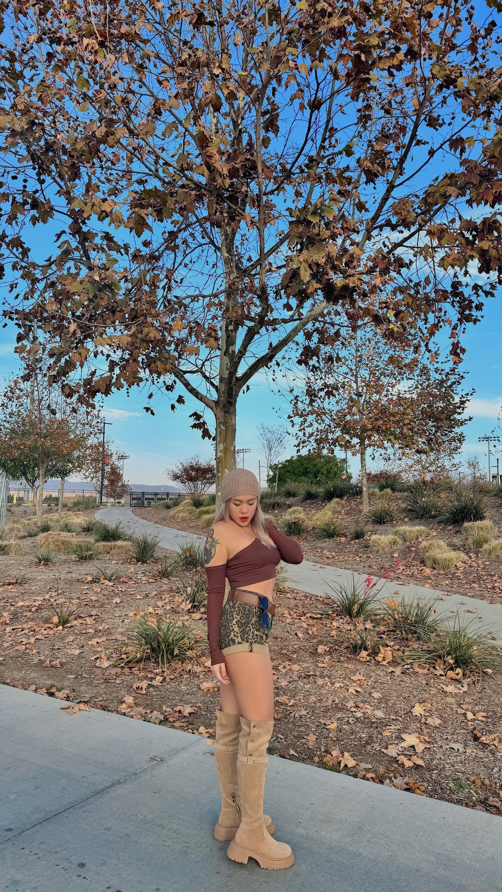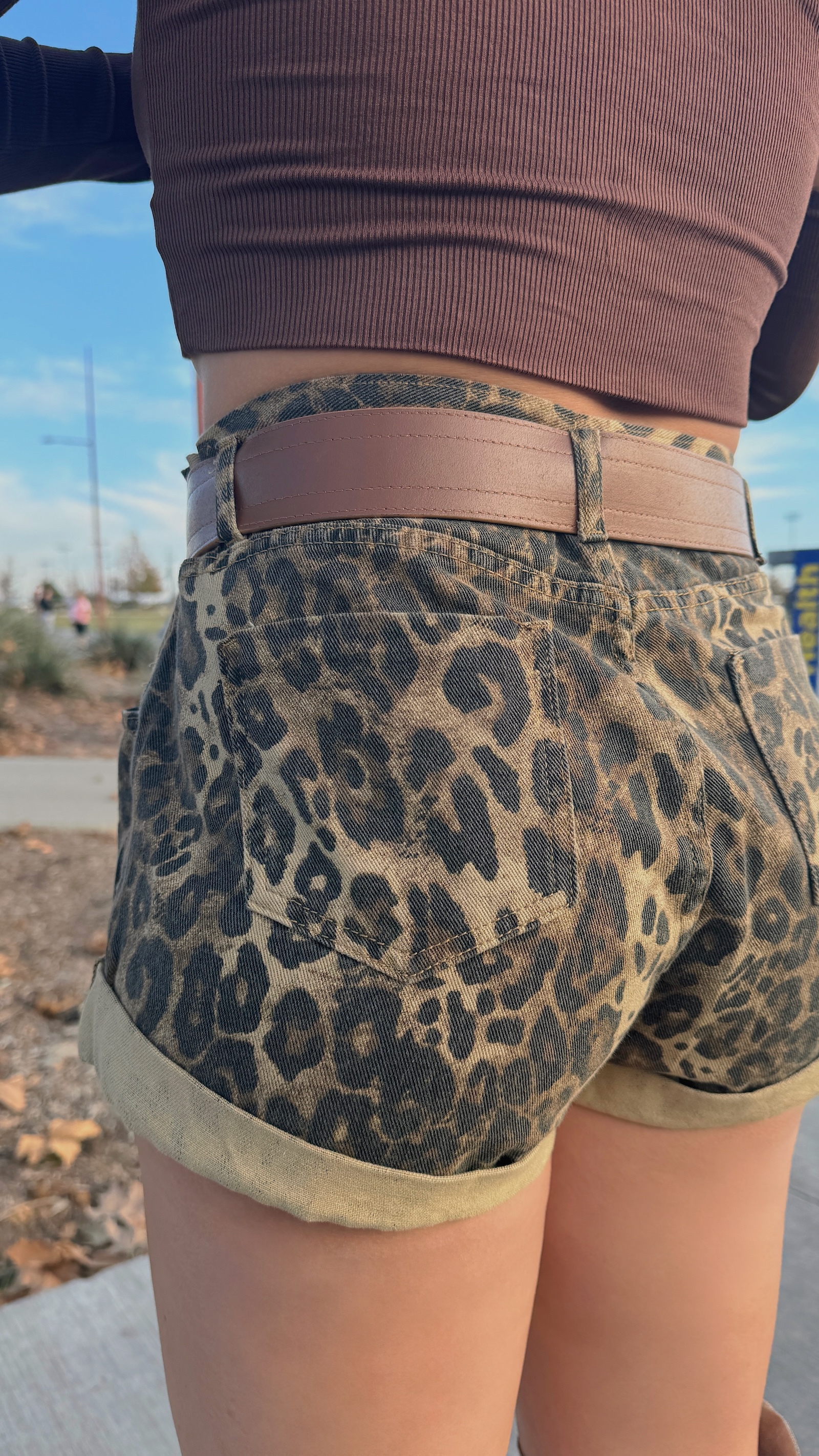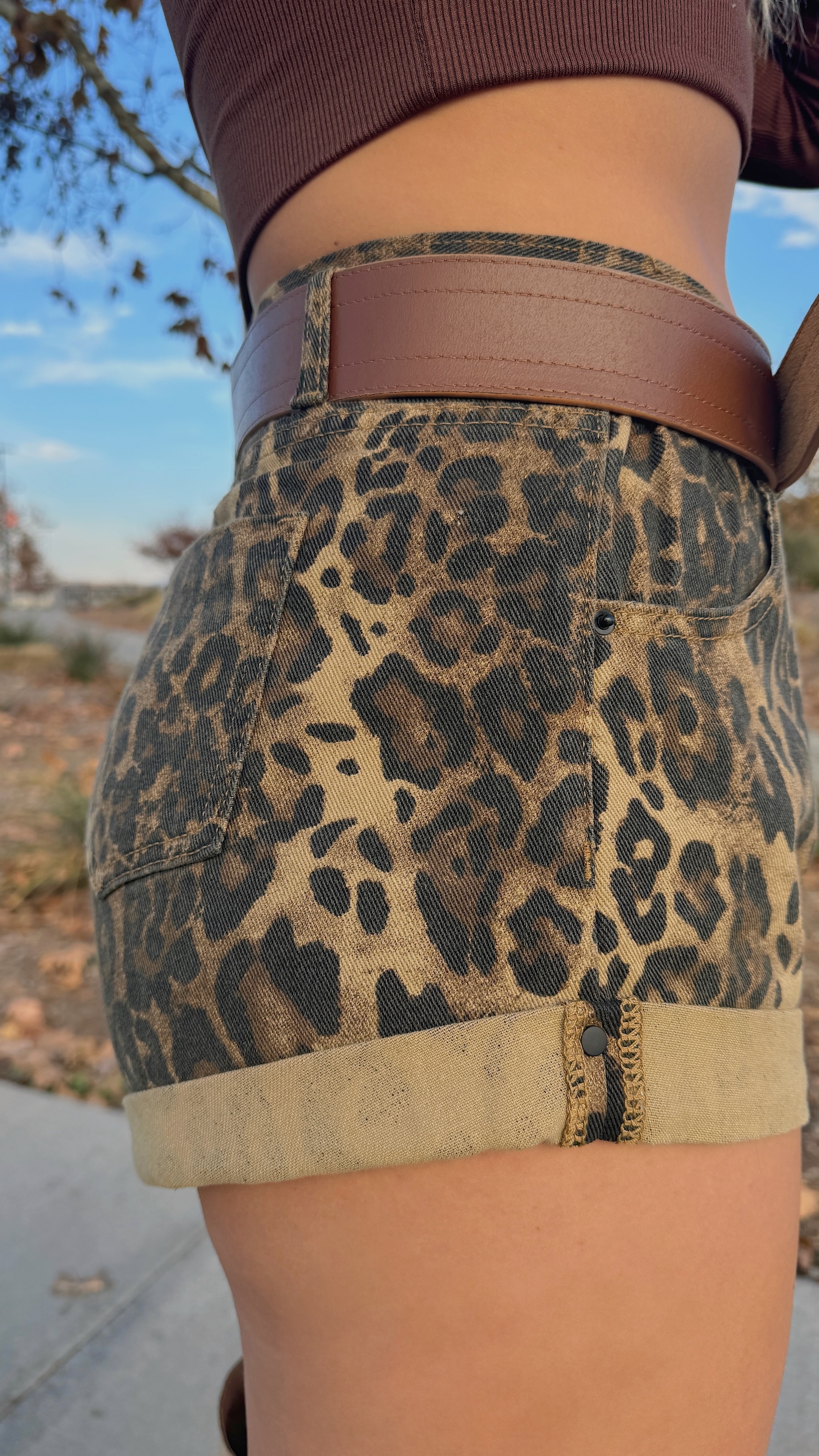 卡其色系的豹紋短褲,秋冬搭配也很有感