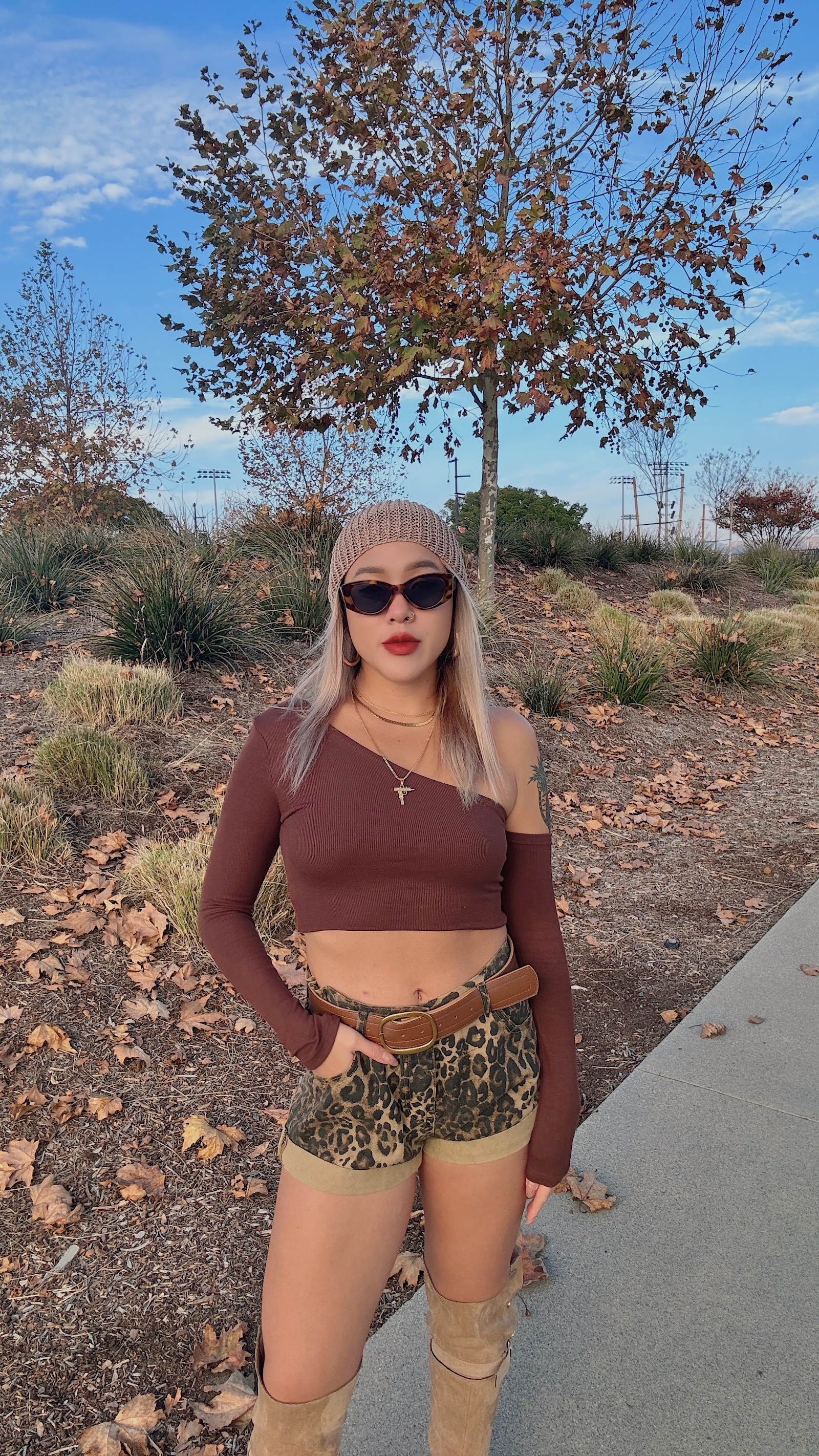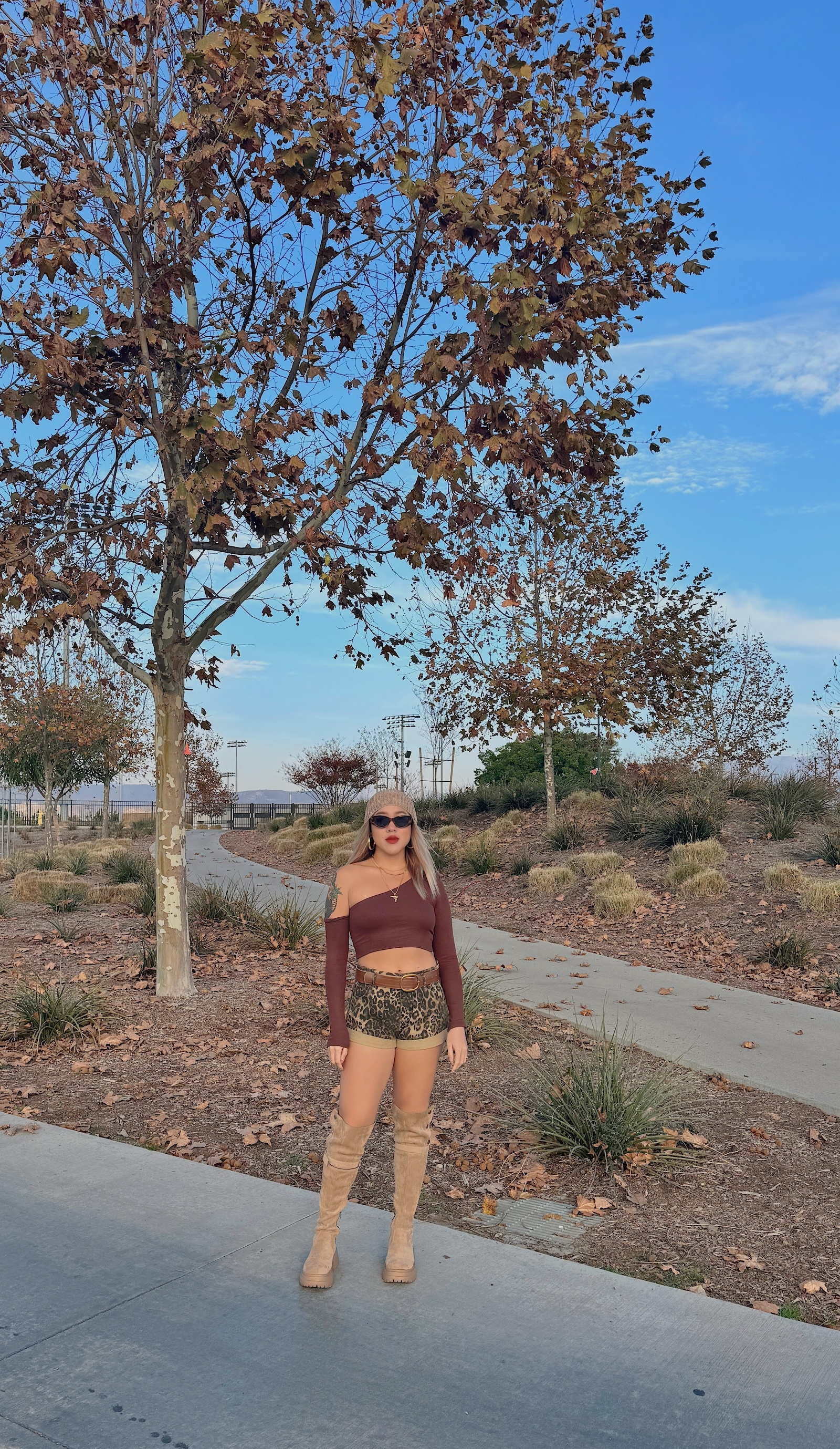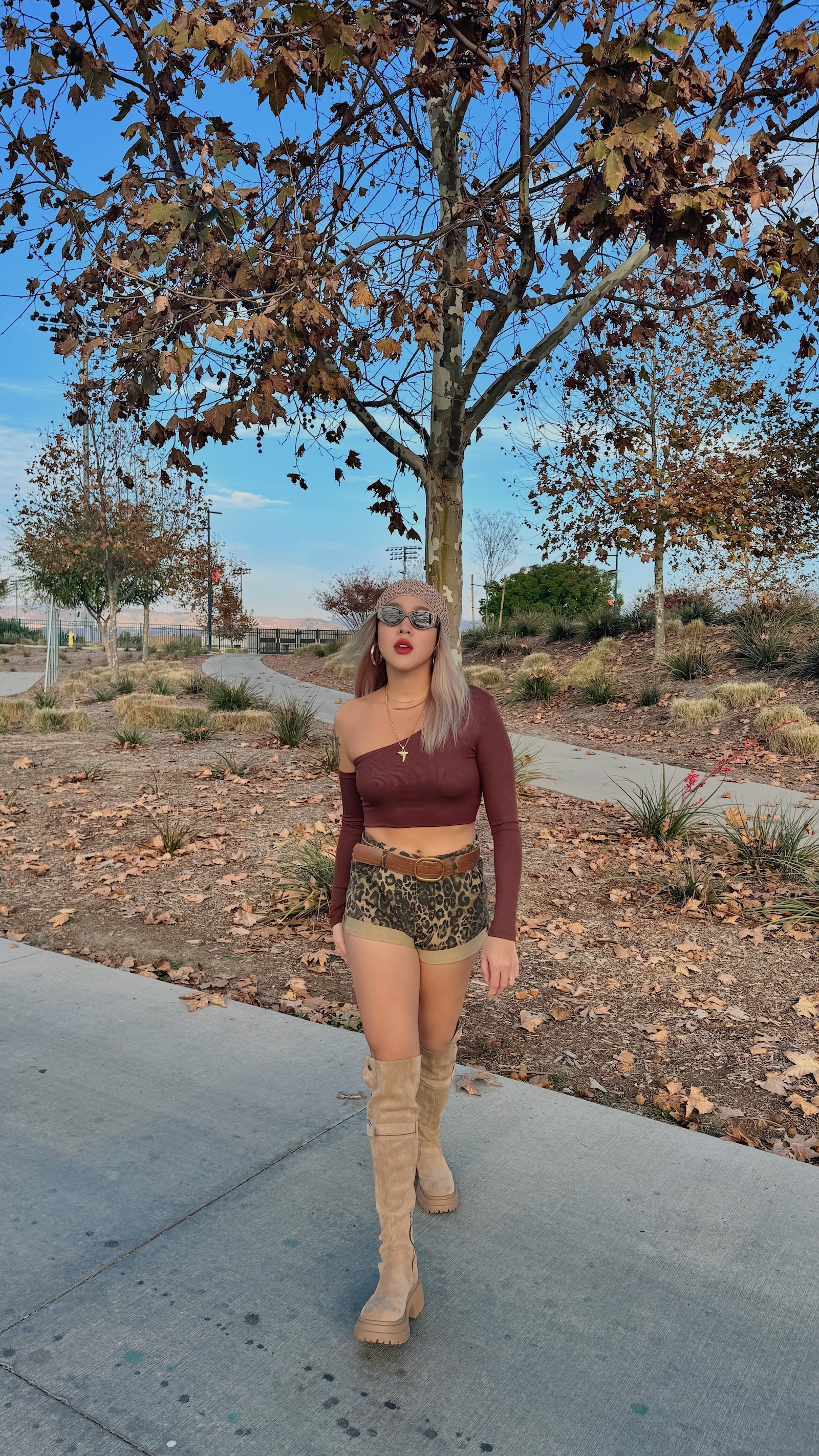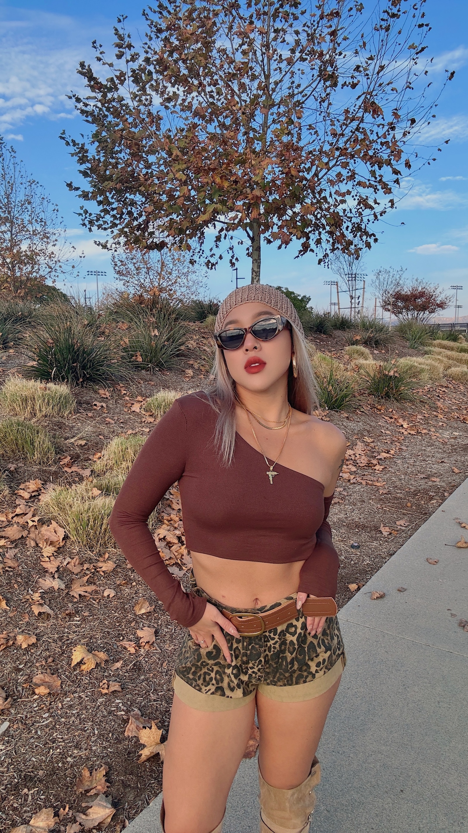 卡其色系的豹紋短褲,秋冬搭配也很有感