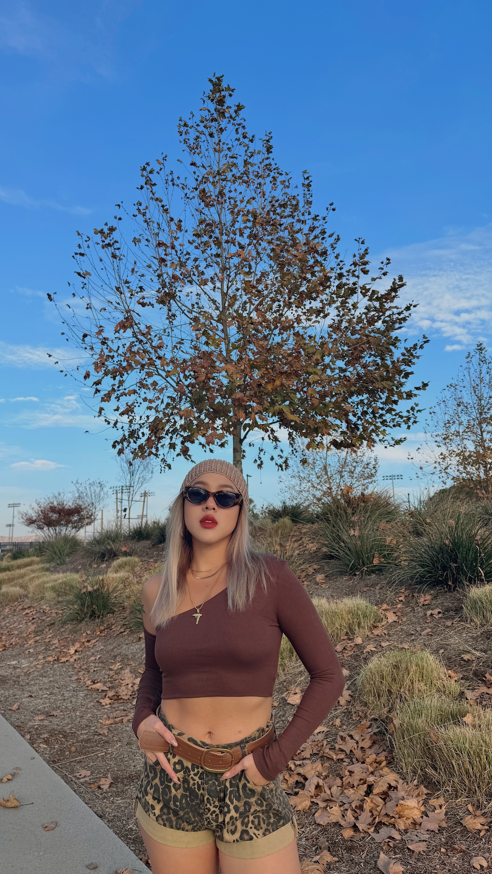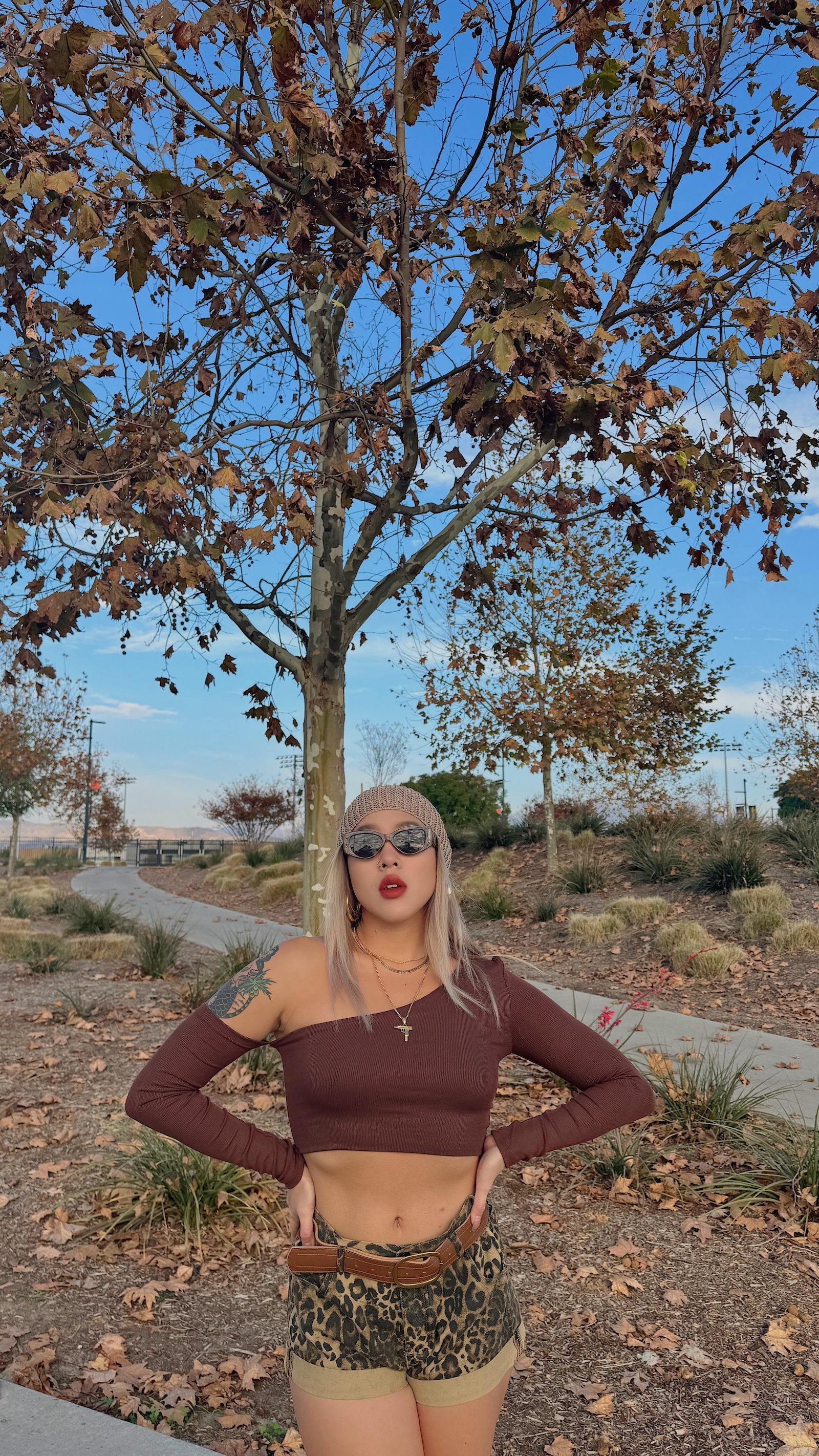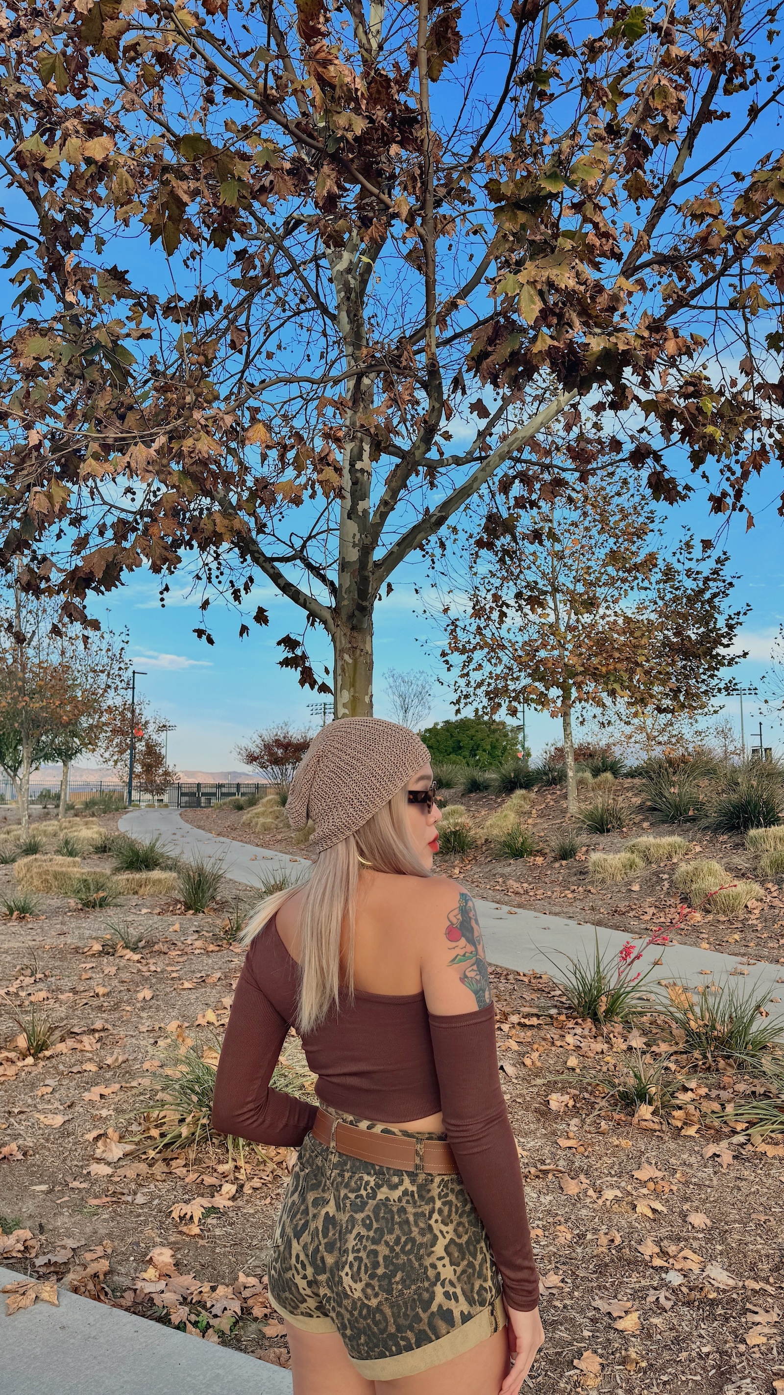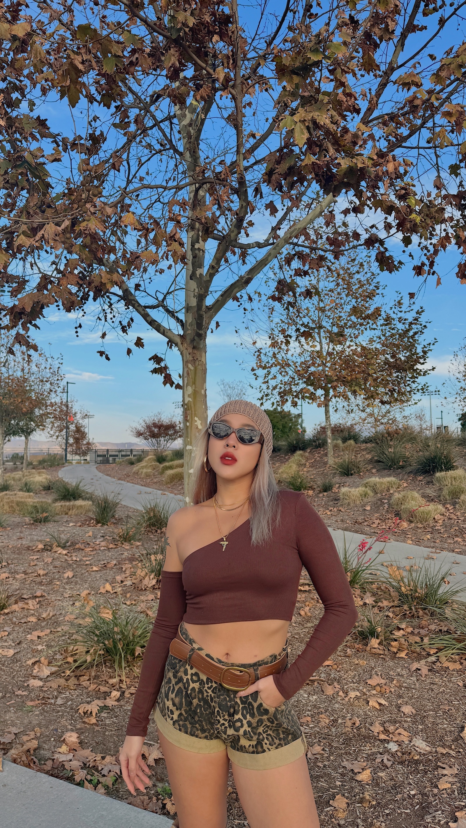 卡其色系的豹紋短褲,秋冬搭配也很有感