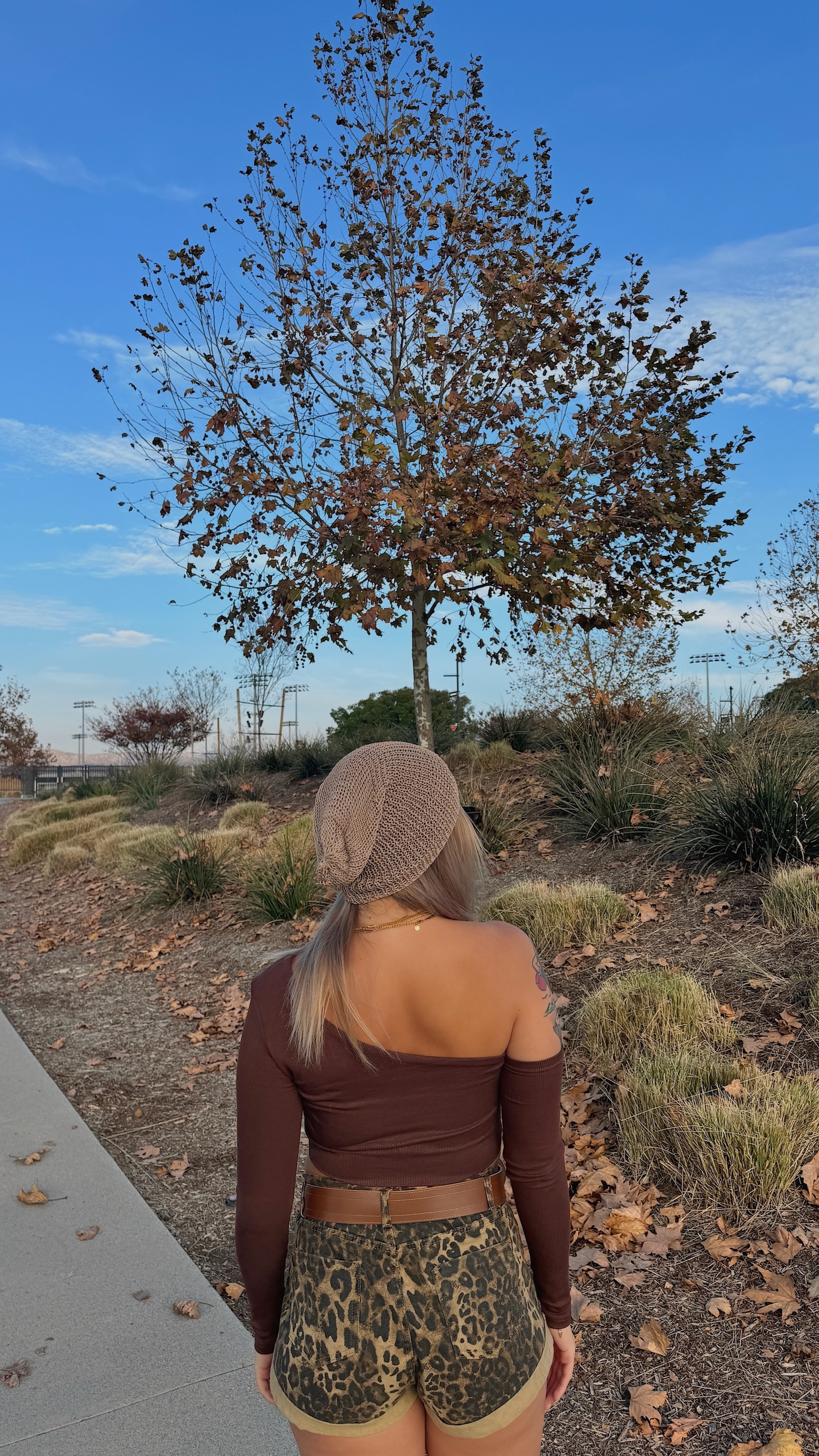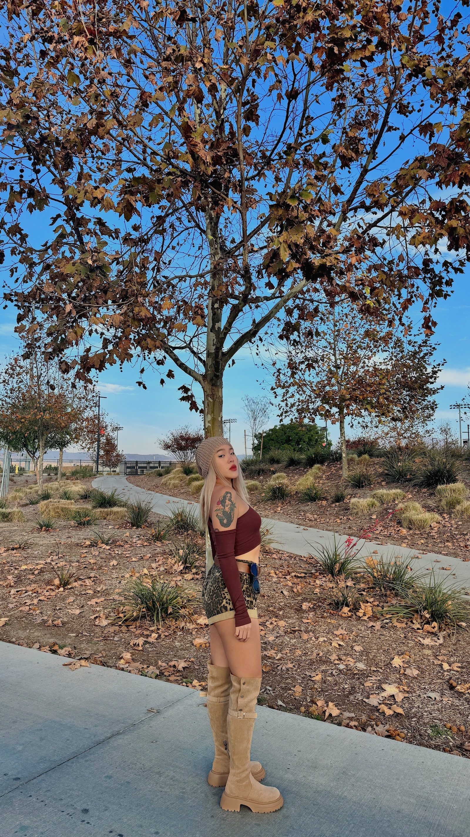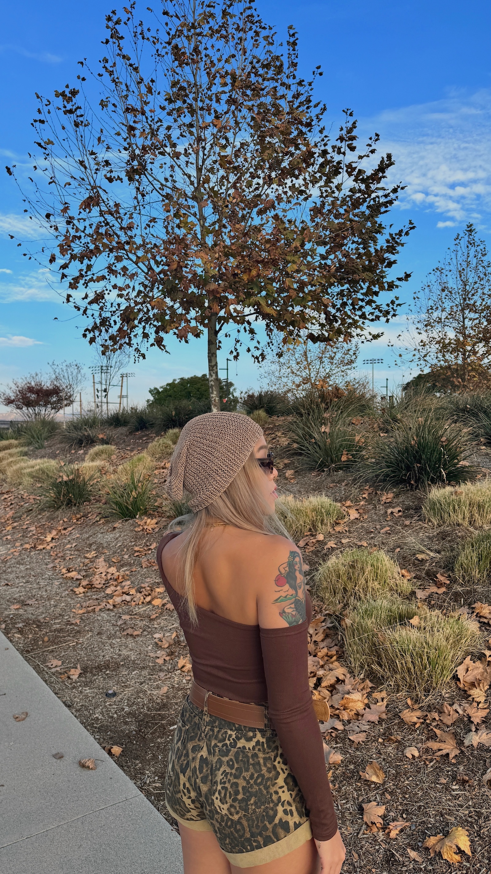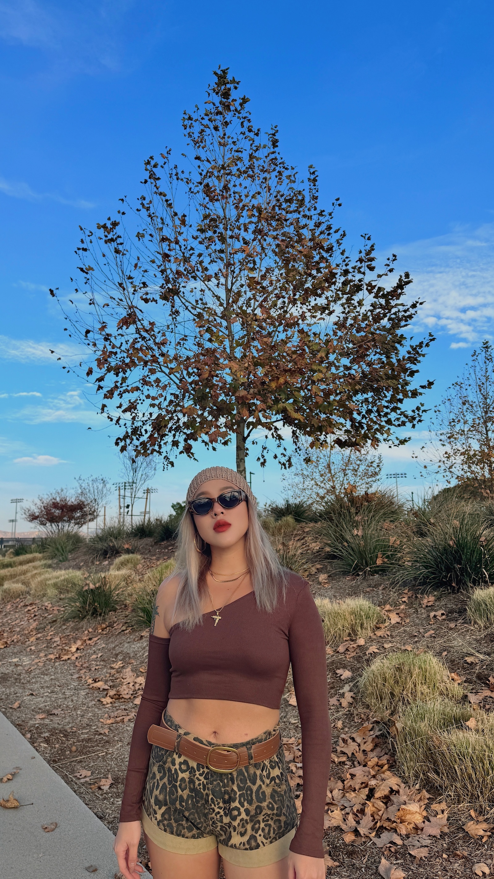 卡其色系的豹紋短褲,秋冬搭配也很有感