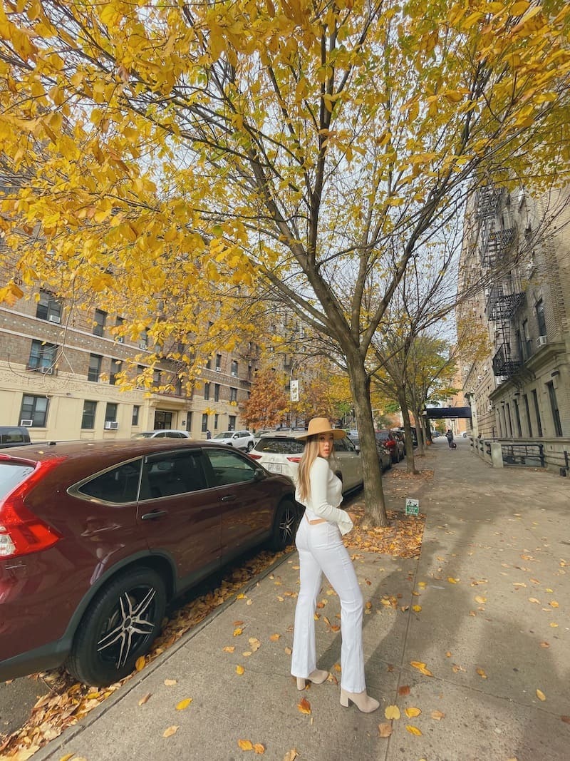 正面就是正常的白色喇叭褲,最心機的就是背面臀圍上方