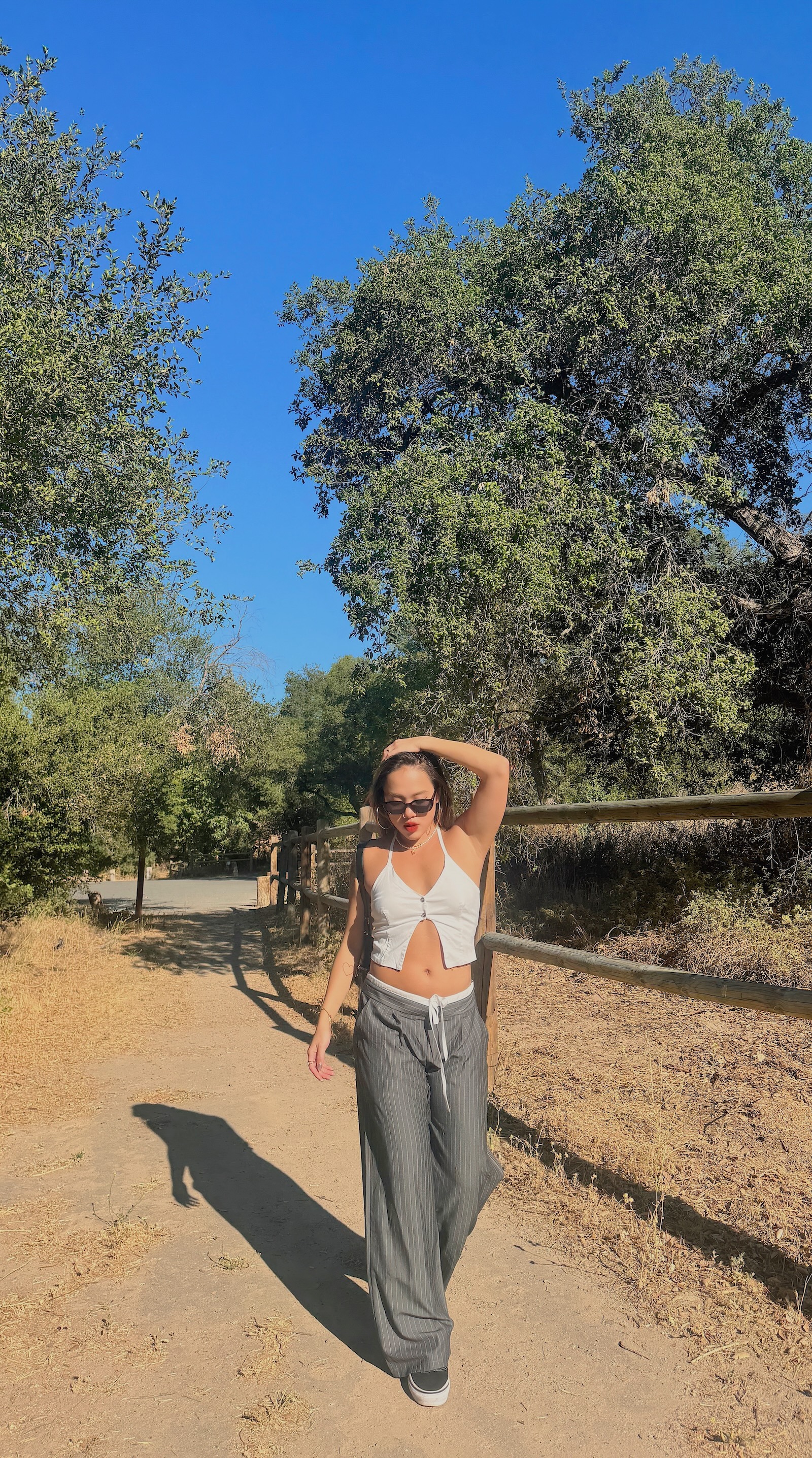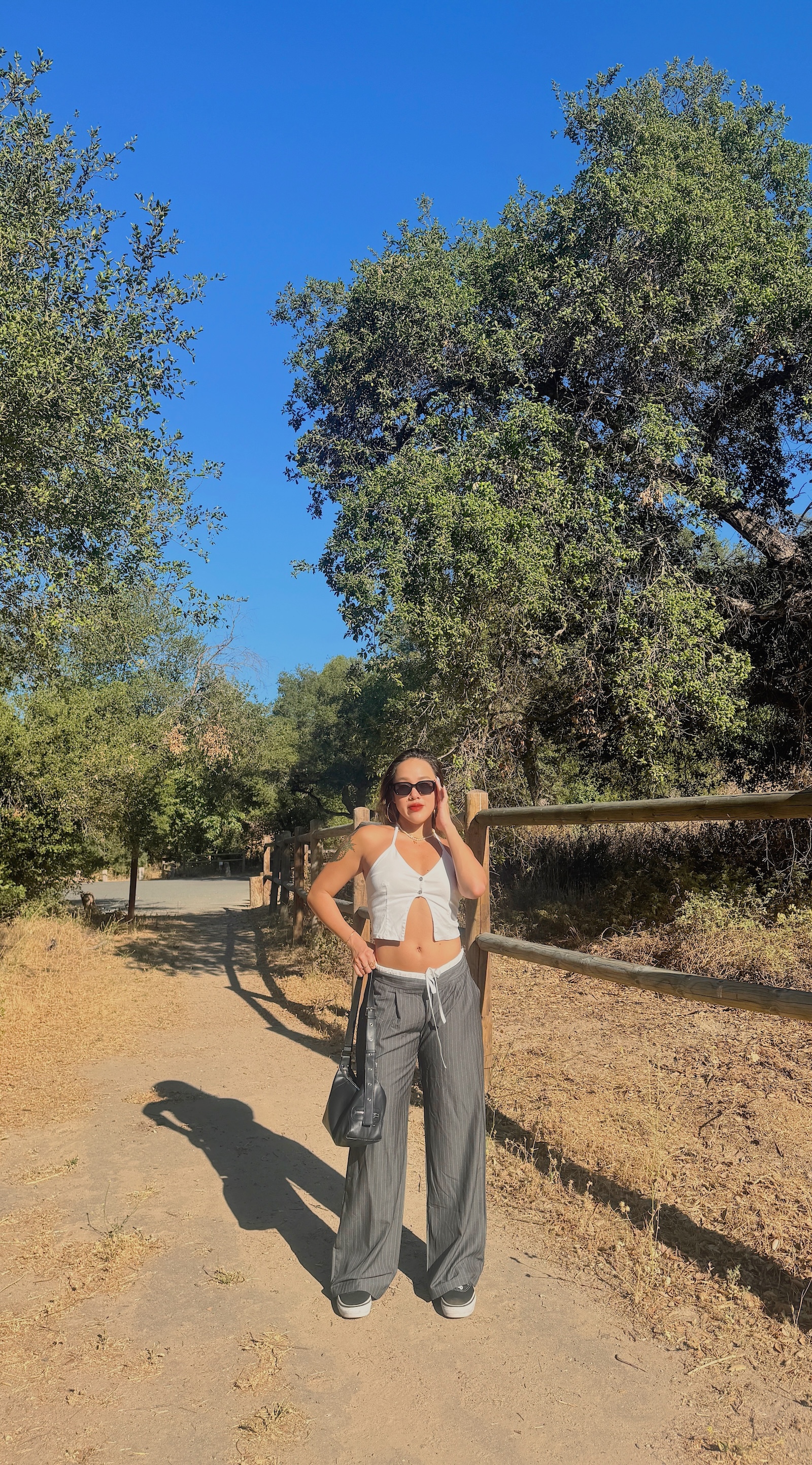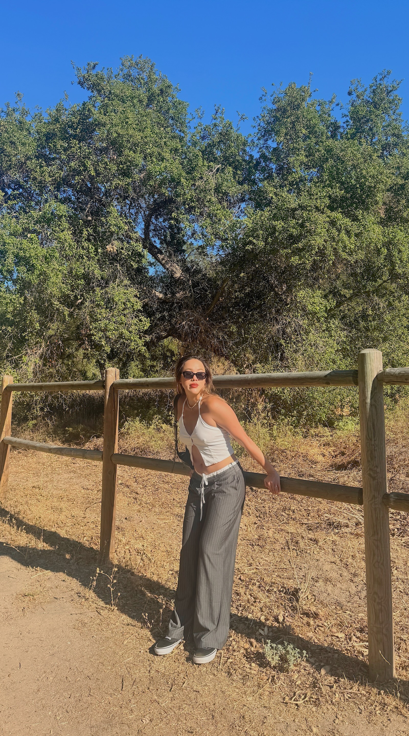 鬆緊腰圍搭配白色褲頭,慵懶時髦